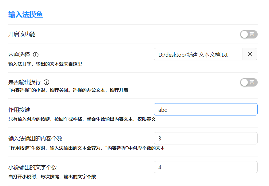 - 小说输出的文字个数,每次按abc后,小说出现的文字个数。如果填写的10,那么按abc+回车/空格,小说窗口里会自动出现10个字的内容